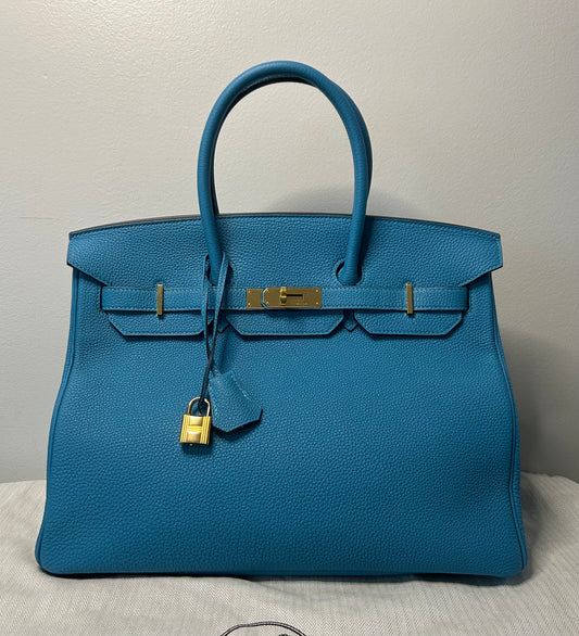 HERMÈS Birkin 35 Bleu Izmir Togo Leather Gold Hardware Handbag