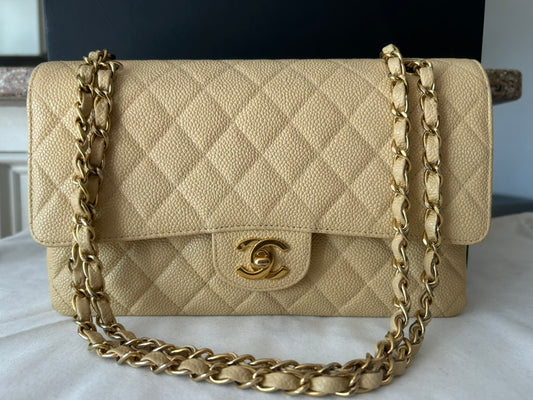 CHANEL Medium Classic Double Flap Caviar Quilted Handbag Beige Clair / 24k Gold