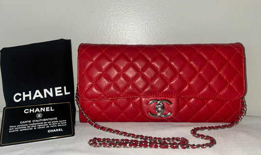 CHANEL Classic Quilted Lambskin Leather East West Shoulder Bag Red