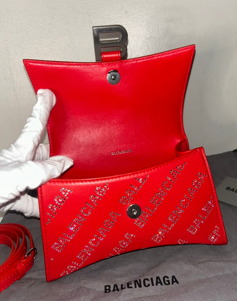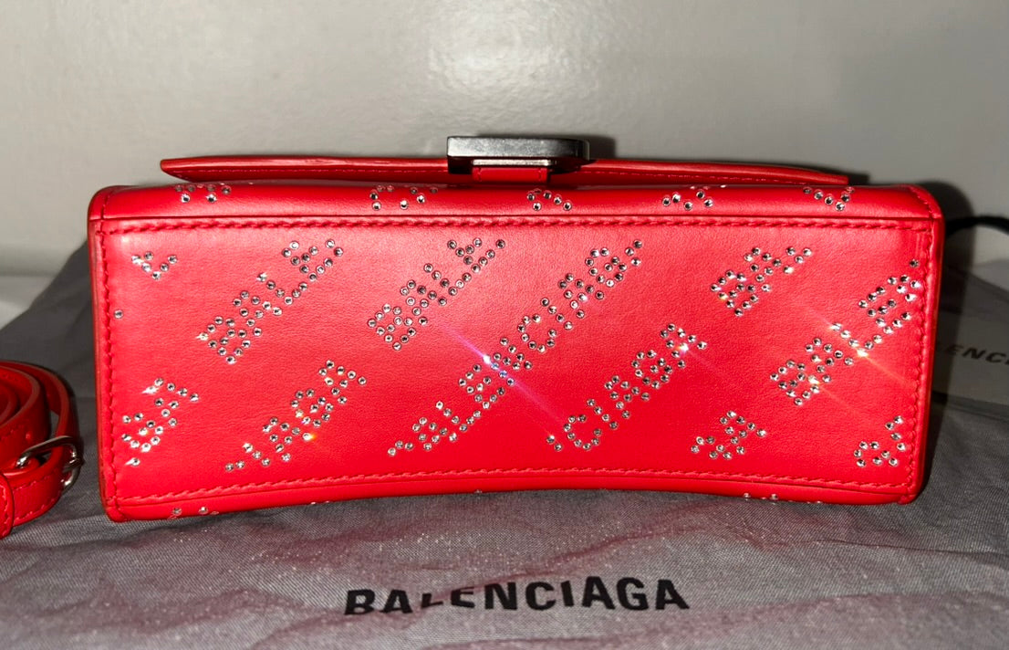 BALENCIAGA Hourglass XS Crystal Rhinestone Logo Leather Handbag Red