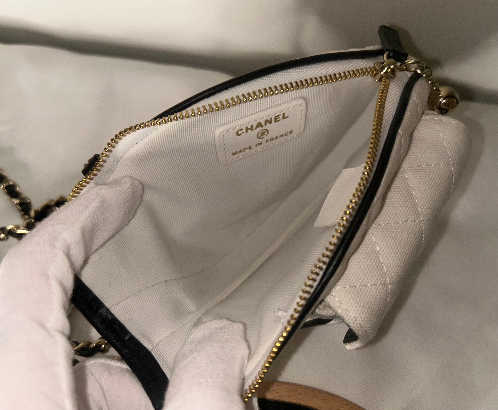 - diamond quilted white cotton canvas exterior with black calf leather trim