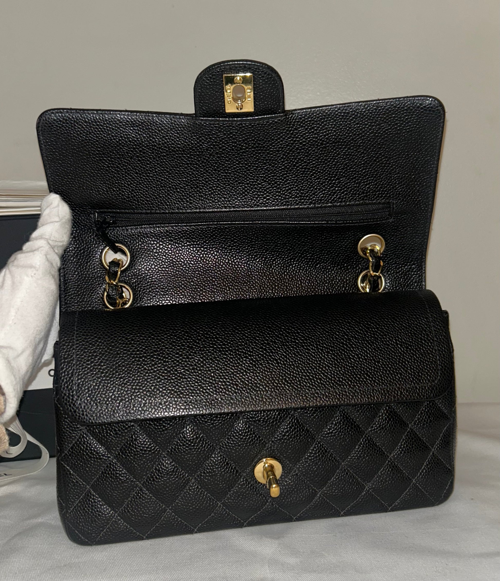 CHANEL Medium Classic Double Flap Caviar Quilted Handbag Black / 24k Gold