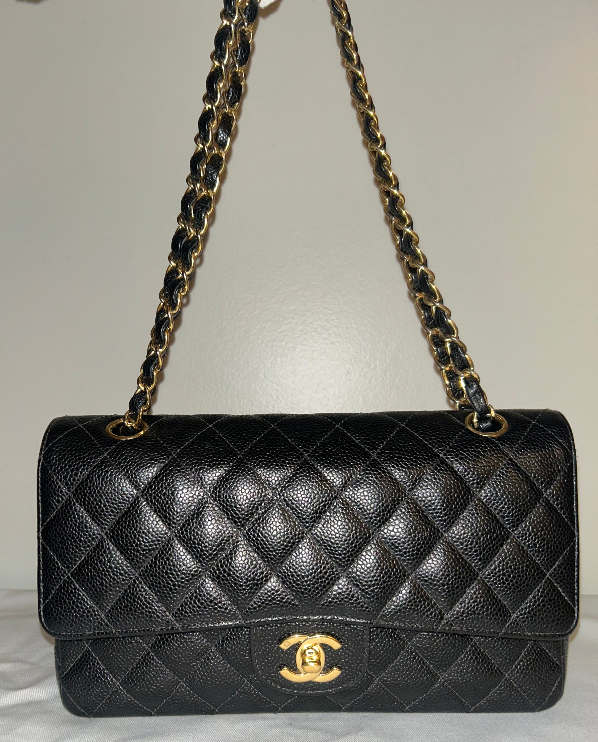 ✨This is a rare and highly sought-after vintage Chanel — featuring the iconic black caviar leather paired with discontinued 24K gold-plated hardware.