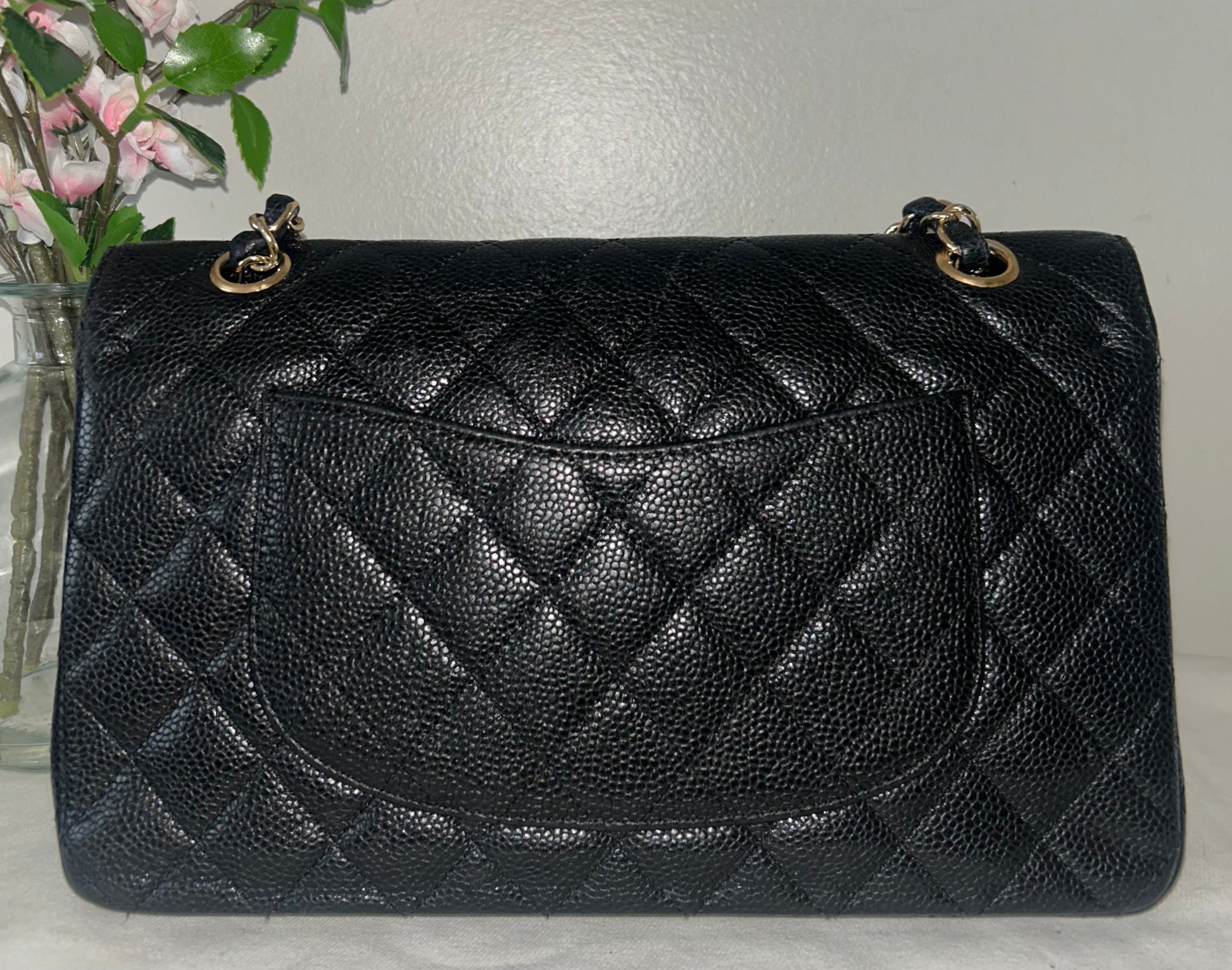 CHANEL Medium Classic Double Flap Quilted Caviar Leather Handbag Black / Gold Hardware