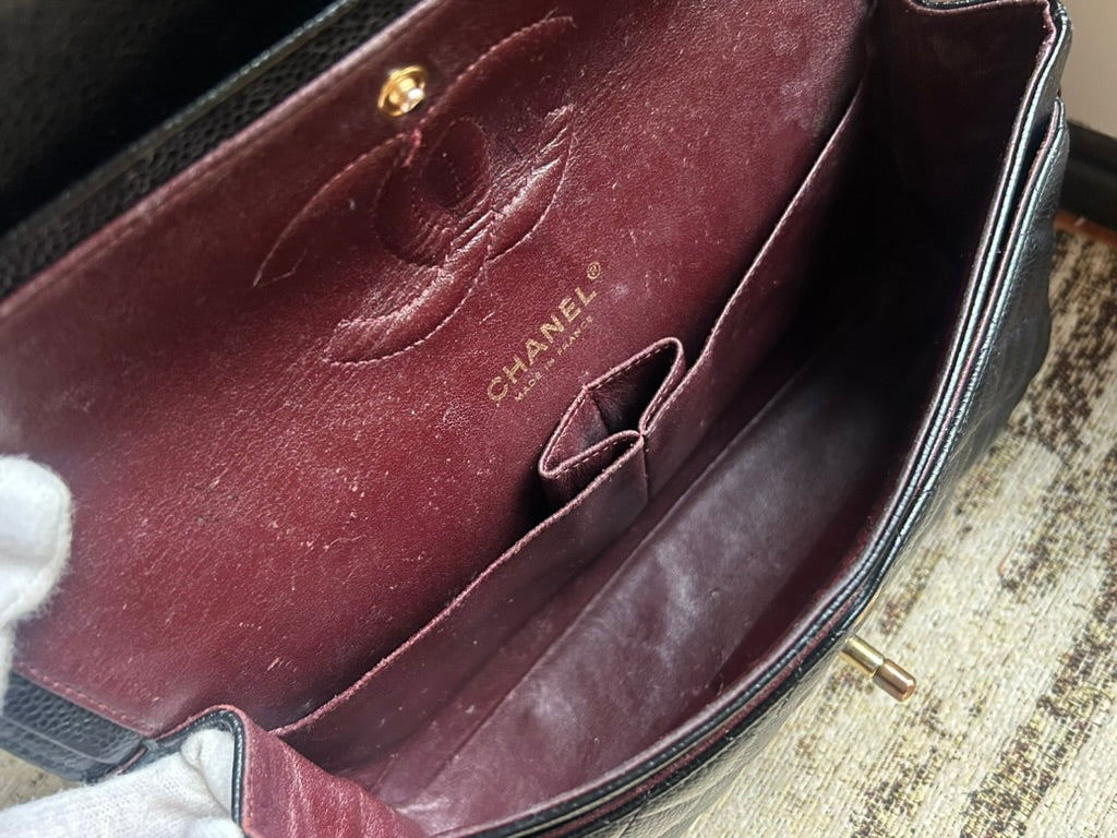 CHANEL Medium Classic Double Flap Quilted Caviar Leather Handbag Black / Gold Hardware