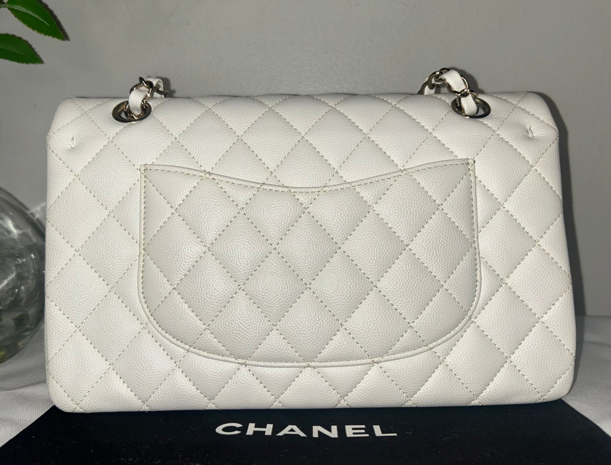 CHANEL Medium Classic Double Flap Quilted Caviar Leather Handbag White / Light Gold Hardware