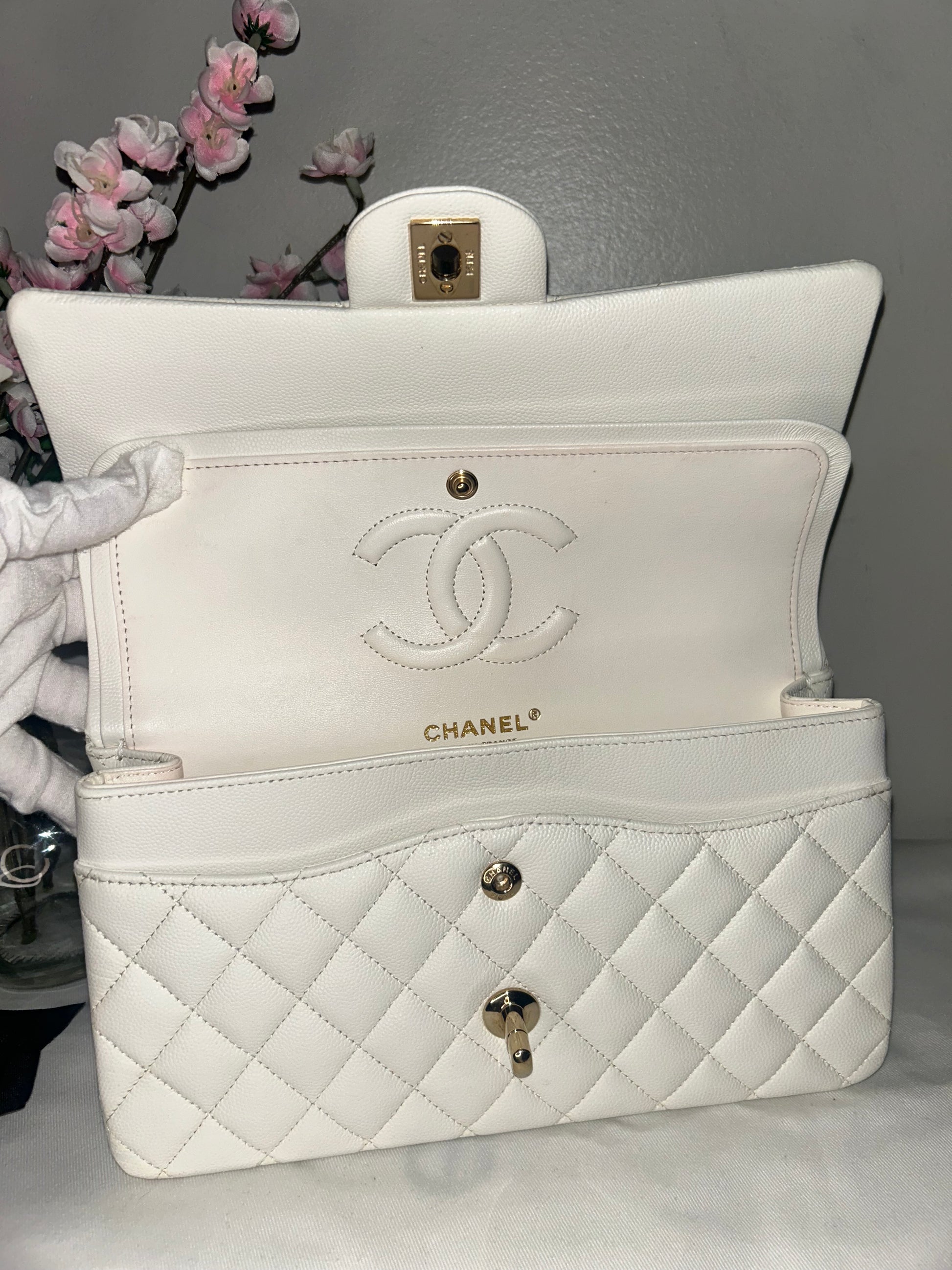 CHANEL Medium Classic Double Flap Caviar Quilted Handbag White / Light Gold HW