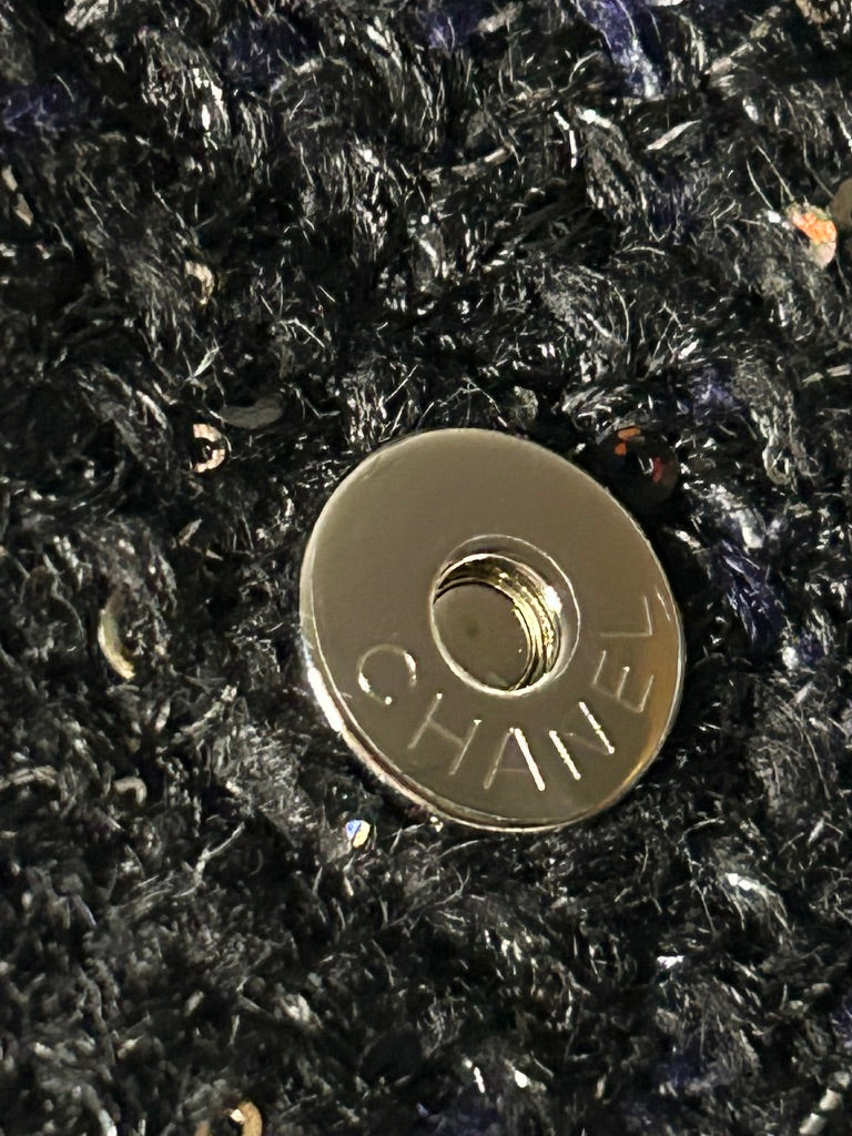 - diamond quilted nylon with black tweed trim with iridescent sequin accents